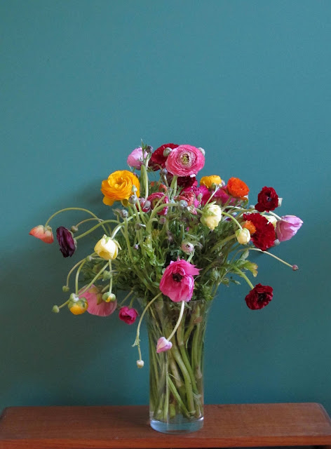 Ranunculus and Snapdragons, big, bold and beautiful. The Ranunculus were priced at 3 bunches for $5.00 as apparently they were past their best (they looked good to me) and the Snapdragons were $5.00 a bunch. BARGAIN!!
